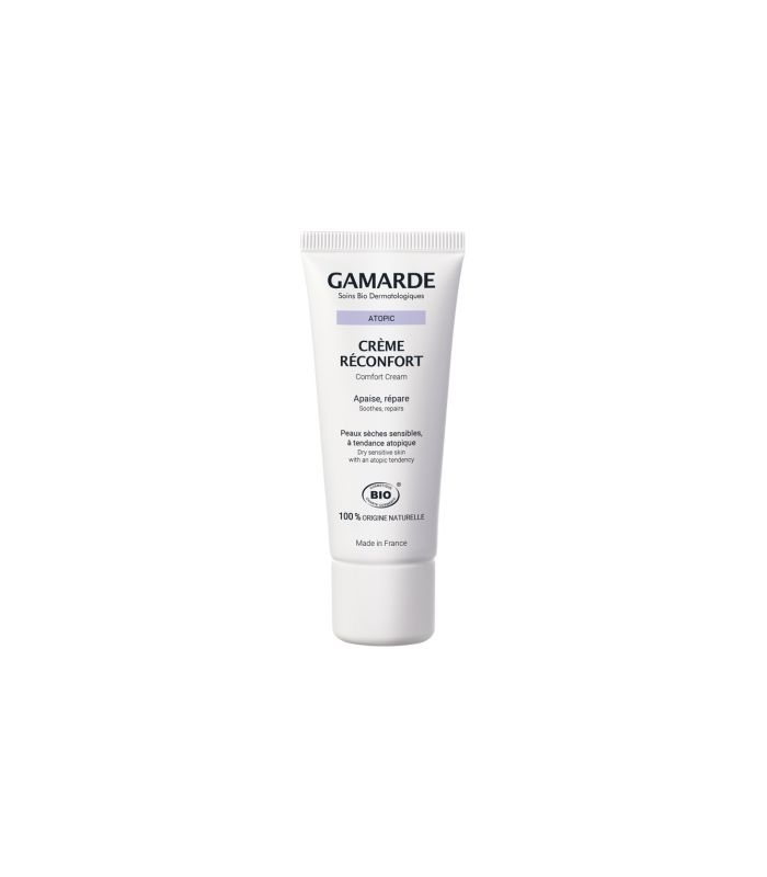 Gamarde Atopic Crème Réconfort Bio 40 ml est un soin qui apaise et répare les peaux sèches et sensibles à tendance atopique dues aux agressions extérieures. Grâce à la Belle de Nuit et au Magnolia qu'elle contient, cette crème diminue les rougeurs et les sensations d'inconfort dues aux agressions extérieures . Le Coton Bio adoucit et l'Aloe vera hydrate tout en apportant une sensation de fraîcheur et de confort. La peau est réparée et moins réactive.