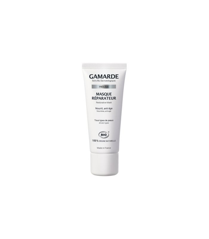 Gamarde Près-Âge Masque Réparateur Bio 40 ml est un soin formulé pour raviver l'éclat et estomper les marques de fatigue des peaux matures. Il contient des huiles essentielles Bio de Cannelle stimulante, d'Origan purifiante et de la Chlorophylle antioxydante. La peau retrouve sa fraîcheur et le teint est radieux.