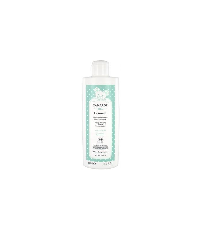 Gamarde Liniment Bio 400 ml est un soin à base d'Huile d'Olive Bio pour le change qui nourrit et protège l'épiderme de bébé.