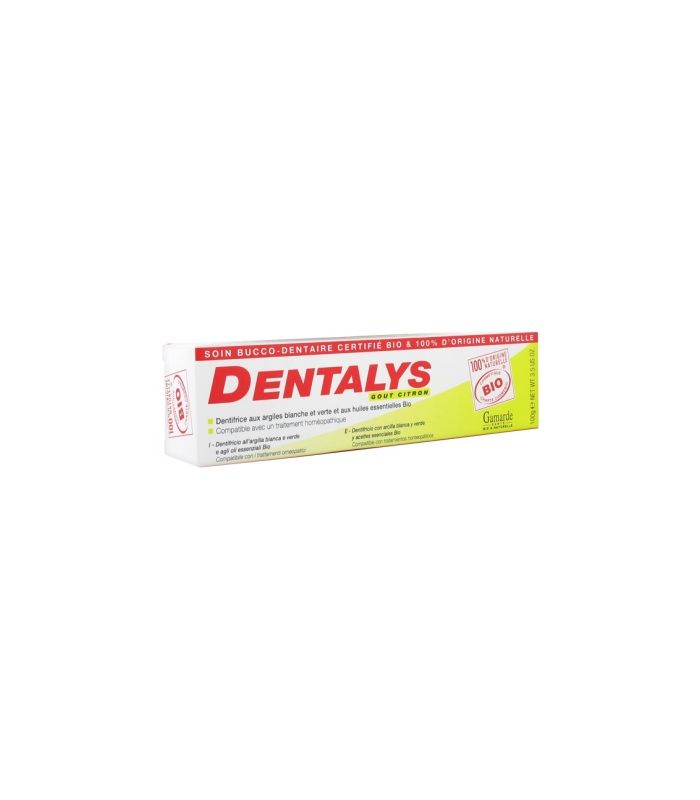 Gamarde Dentalys Goût Citron Bio 100 g est un dentifrice riche en eau de Gamarde, aux argiles blanches et vertes et aux huiles essentielles Bio. Il nettoie en douceur et rafraîchit l'haleine.